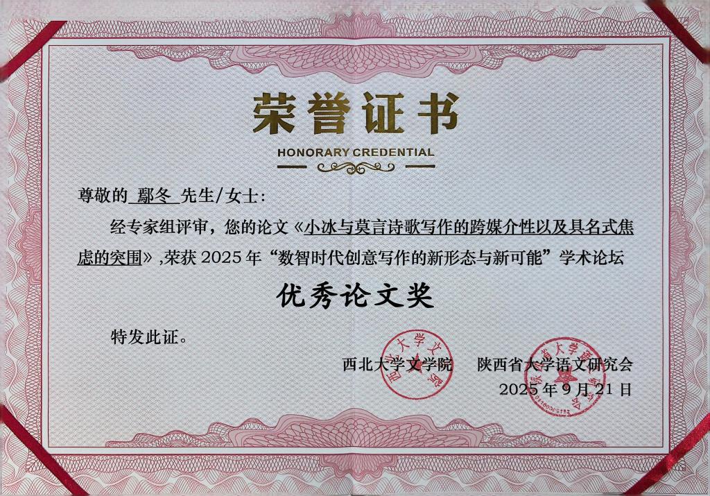 9月20日至21日,由西北大学文学院、陕西省大学语文研究会主办,高等教育出版社协办的“数智时代创意写作的新形态与新可能”学术论坛暨“创意写作中西部联盟”成立仪式在西北大学太白校区举行。我院鄢冬副教授受邀参加会议。